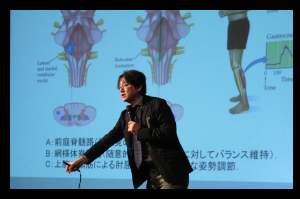 歩行運動中の下肢動作を再現することにより、完全麻痺状態にある下肢筋群に歩行周期に同調したリズミカルな筋活動が発現する。歩行様筋活動は、脊髄歩行中枢を介して発現する。