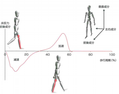 身体重心に向かう床反力は①はマイナス(減速)②はプラス(加速)なる