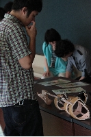 前半は装具や継ぎ手の歴史の説明がなされ、その内容のブレイクに差し掛かったとき、今回発案した、継ぎ手のヒントは釣りに使用する鉛(ガン球)をいれる容器を見たときに得られたことを紹介された。