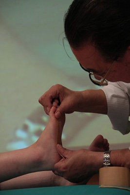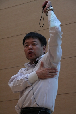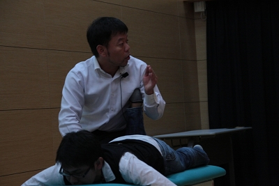 体幹のポイントを圧迫もしくは牽引するだけで、関節可動域が改善する。そんな魔法のような手技を先生は疲労してくれた。ほんの10秒ほど胸郭のあるポイントにアプローチをおこない可動域が改善したとき、会場にどよめきが起きた。次々と被検者の可動域が改善される。なぜそうなるのか・・・。「根拠はよくわからないが、結果は出ている。この結果を私は示した。根拠を知りたいのであれば、若い君たちがそれを示してくれ。」「私の手技や理論はあくまでも一つの事実として受け止めて、それが他者への刺激になればよいと思っている。」と先生は詳しくは語らなかった。
