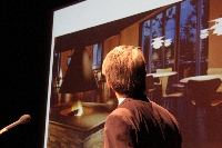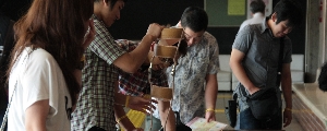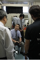 ベッドの上で体の半分をベッドから出し、支持基底面を少なくして、片麻痺患者の身体感覚を少しでも理解できるような環境設定をする。その状態でタオルを全身にかけるように指示をする。通常の状態より支持面が少ないため、動作も安定せず、中枢部の固定も不十分であるため、四肢遠位の使用もままならない。単純な環境設定ではあるが、「片麻痺」という身体認識能が低下している状態を経験することができるものだと感心させられた。答えがわかれば、たやすいものだが設定を創り上げる松崎先生の「脳力」にグッと引き込まれた印象であった。