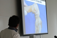 遺体を使った解剖から得られた新たな発見や衝撃の事実が次から次へと明らかになった。膝を解剖して実際にみてみると局所的に関節軟骨が磨耗していることがよくあるという。点々の傷は局所的に圧力がかかっているという裏づけであり、ADL的にみると歩行時のIC、起立時の殿部離床期にパテラが大腿骨に押し付けられ大きな負荷をかけているのではないかと。その負荷により軟部組織も傷つけているという。実際の所見では関節面が通過する組織が毛羽立ったようになっている。ひどいものは関節面が真っ平らになっているとのこと。関節軟骨が全くないものも稀にあるとか。関節軟骨が全くないため大腿骨の凸と脛骨の凹が一致するまで磨耗する症例もある。その他の所見では線が入っている傷が半月板損傷の症例で多いとのこと。原因はパテラの形状にもある。膝を屈伸することによりパテラの突起部位が引っ掻くという原理で傷がつく。その結果半月板に影響を与える。半月板や関節軟骨が磨耗すると膝周囲の靭帯の緊張が弛んでしまう。通常大腿骨と脛骨の間に半月板などの組織が存在していたわけで、その存在したものがなくなると靭帯が弛んでくるのがイメージできる。その結果膝の動揺が生じてくるという。